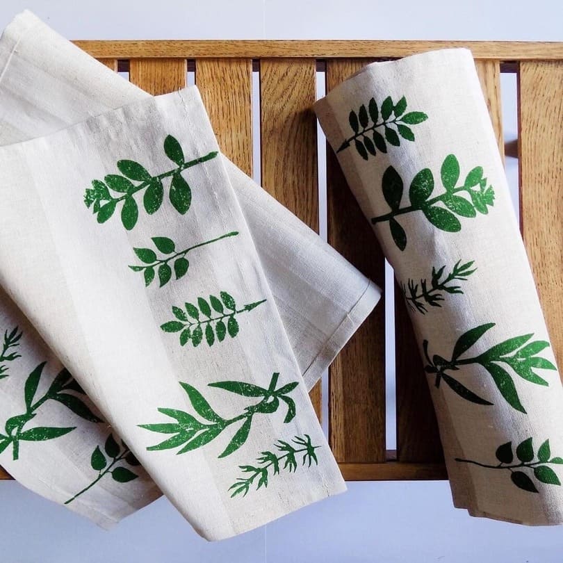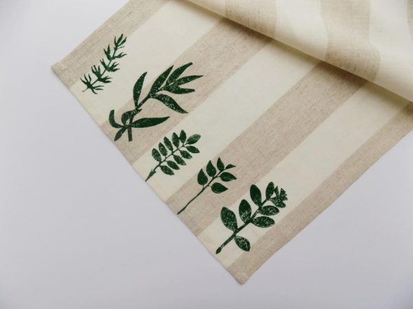 Тканина: 70% льон, 30% бавовна. Малюнок нанесено вручну дерев”яними штампами фарбою для тканини.