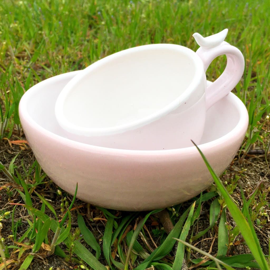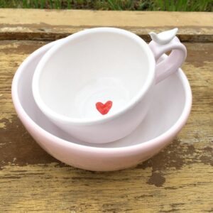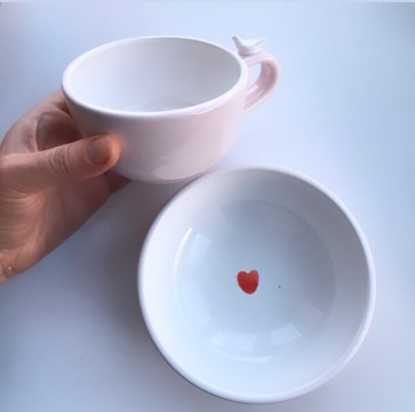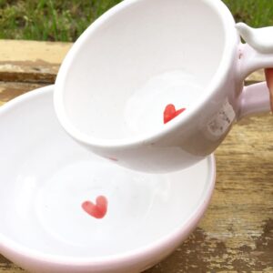 Набір керамічного посуду ніжного рожевого кольору із сердечком