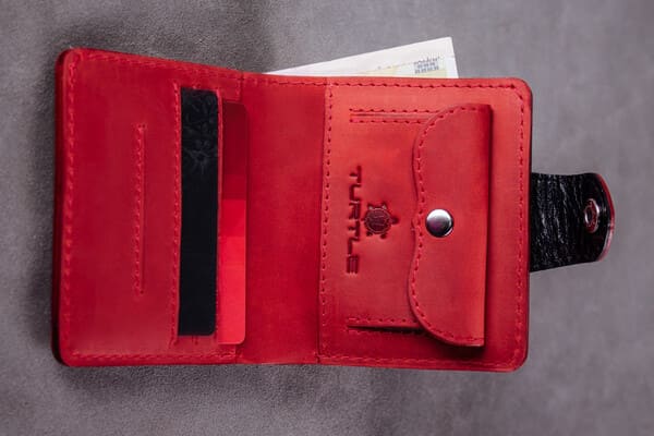Гаманець має 1 відділення для паперових грошей, кишеньку на заклепки для дрібниці, а також 4 відділення для карток (куди в 1 відділення можна помістити від 1 до 4 карток). А також передбачено 2 прихованих кишені.